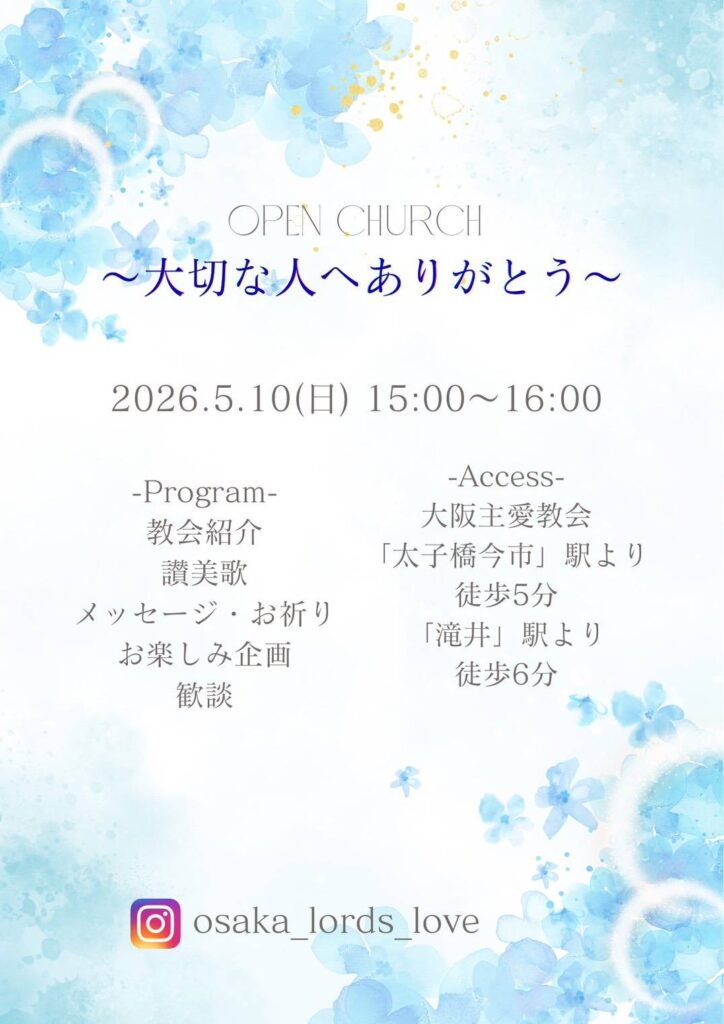 Home お知らせ 5/10「オープンチャーチ」のお知らせ 5/10「オープンチャーチ」のお知らせ 2026.04.21 お知らせ Tweet Share +1 Hatena RSS Pin it ⛪️5月10日オープンチャーチのお知らせ📢 日時:2026年5月10日(日)OPEN 14:50START 15:00〜1時間程度 場所:大阪主愛教会 聖殿本堂 テーマ:大切な人へありがとう 締切:5月3日(日)中 参加申込:以下よりお問い合わせください。 お問い合わせ Tweet Share +1 Hatena RSS Pin it コメントは利用できません。